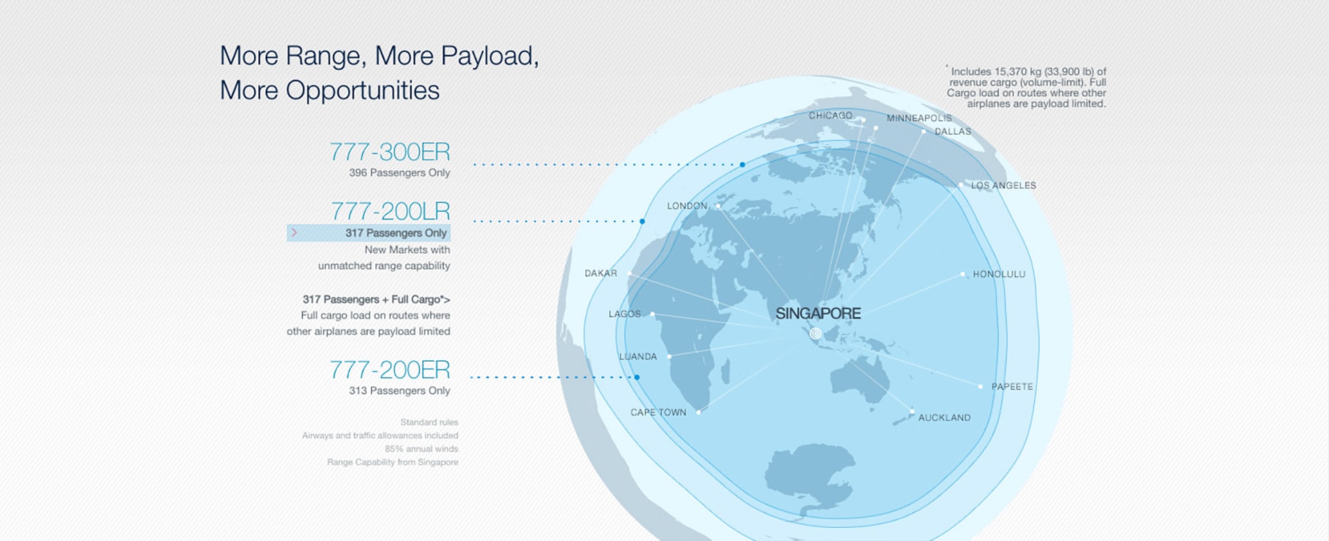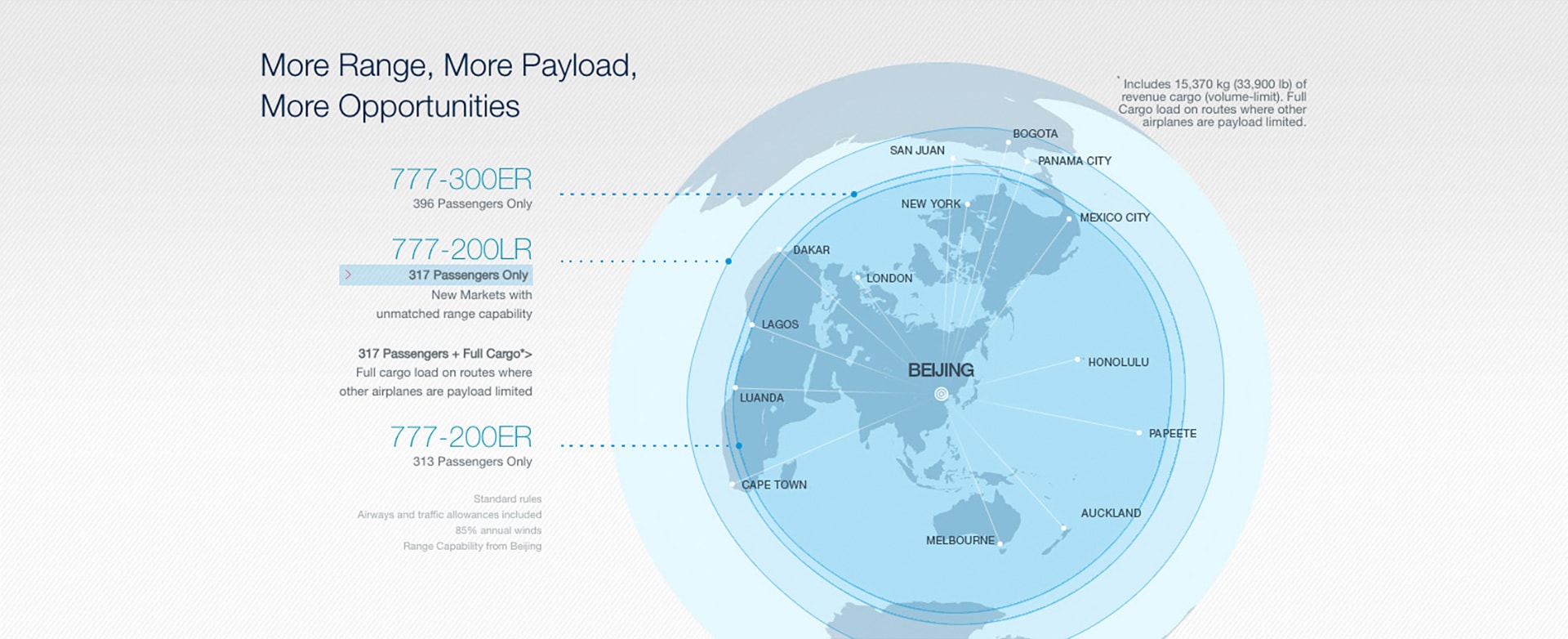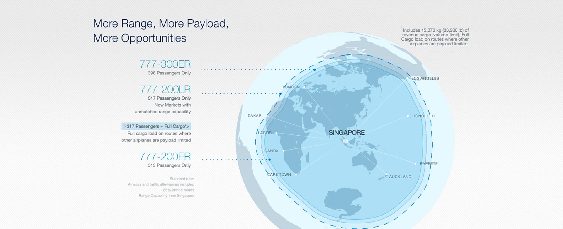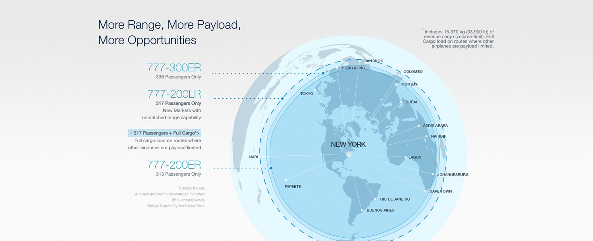 Airlines have only begun to capitalize on demand for point-to-point service in intercontinental markets. The 777 has both the range to fly these very long routes nonstop and the revenue payload capacity to earn a healthy profit throughout the year.