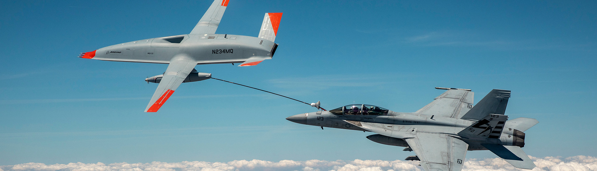 MQ-25 will unlock manned-unmanned teaming for the carrier air wing and will pioneer technologies for seamless integration of future manned and unmanned systems. Boeing has virtually demonstrated an F/A-18 pilot commanding an unmanned MQ-25 to release a refueling drogue and refuel the Super Hornet, using existing communications links on both platforms.